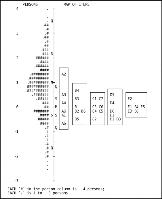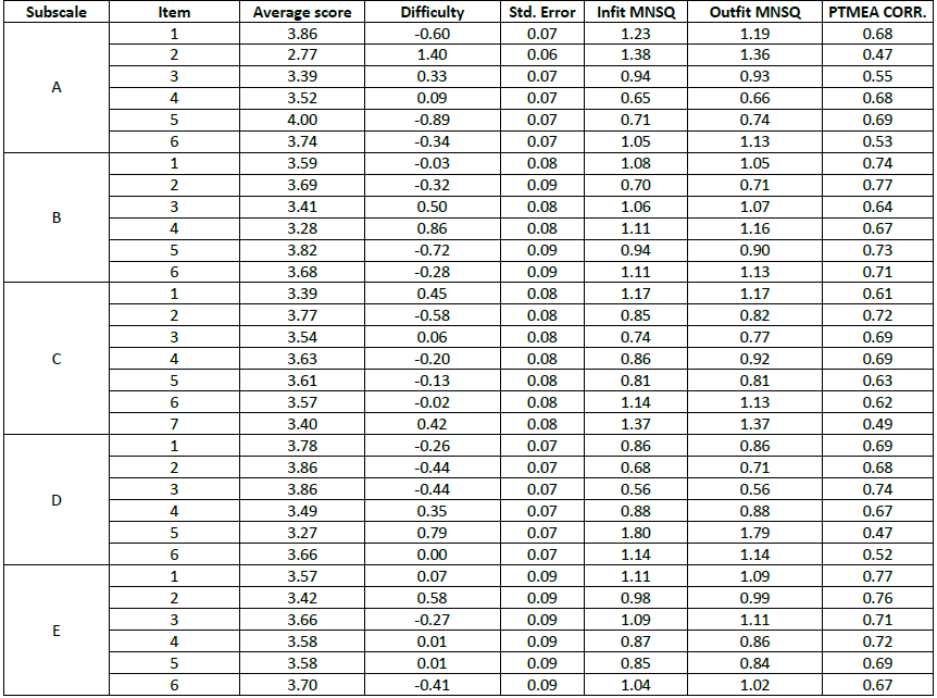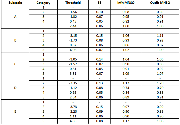 Of the subscales displayed in Table 5, subscale E — consisting of six items — had the widest range of thresholds from a low of −3.73 to a high of 4.85 and no presence of reversal. Subscale A contained items with the narrowest range of thresholds from a low of −1.56 to a high of 2.44. Categories statistics in each subscale found a reasonable distribution and the difficulty level was gradually increased from category 1 to 5. In other words, it was harder for examinees to obtain a score threshold of 5 rather than of 4, 3, 2, or 1. Additionally, the categories of all subscales had good infit and outfit statistics, with values close to 1. 19