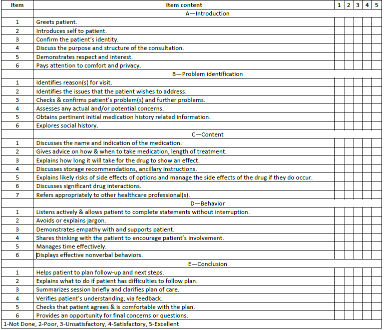 The study scale was developed based on three previously published medication consultation models: the Calgary-Cambridge guide developed by Kurtz et al. 14, the United States Pharmacopeia Medication Counselling Behavior Guidelines redeveloped and then validated by Puumalainen et al. 11, and the Medication-Related Consultation Framework developed by Abdel-Tawab et al. 9 From these models, subscales and their corresponding items were collected to suit the context of current pharmaceutical care in Vietnam. Finally, five subscales consisting of 31 items relevant to activities and behaviors of medication consultation were selected on the scale ( Table 1), which was structured as follows: subscale A—Introduction (n=6 items), subscale B—Problem identification (n=6 items), subscale C—Content (n=7 items), subscale D—Behavior (n=6 items), and subscale E—Conclusion (n=6 items). All items were rated by pharmacists on a five-point Likert scale ranging from 1 (not done) to 5 (excellent).