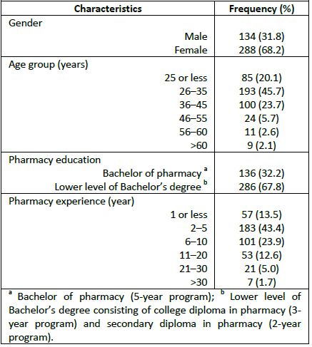 There were 422 completed questionnaires with all the answers, with a response rate of 75.4%. Psychometric properties of the study scale were considered on this dataset. Nearly 70% of the respondents were female pharmacists with a lower level of a Bachelor’s degree 35; most of the respondents were in the age range of 26–35 years (45.7%) and had a pharmacy experience range of 2–5 years (43.4%). A description of the participants’ demographic characteristics is shown in Table 2.