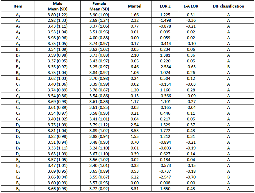DIF analysis ( Table 4) with reference group (female) vs. focal group (male) showed that all items in the scale had no DIF except for B 4 and E 4. Their Mantel value was greater than the critical criterion of 3.84, the LOR Z value was less than -1.96, and the magnitude of DIF was moderate (class B). However, they were within acceptable limits of the present study.