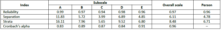 The results showed that reliability of the scale and person were very high, with an item reliability value of 0.97 for the overall scale, within the range of 0.94–0.99 for five subscales, and 0.96 for person’s ability (shown in Table 6). This suggested that individual items had a high level of internal consistency in construct. Additionally, the item separation values of the overall scale (6.11), of five subscales (range of 3.99–11.83), and of person’s ability (4.78) are well in accordance with those proposed by Fisher, who stated that a separation index above 3 is good. 31 Based on the results of the strata index calculation, the scale’s difficulty could be separated approximately into eight distinct levels; person’s ability was separated approximately into seven. Further, the study also found a high Cronbach’s alpha coefficient (0.96).