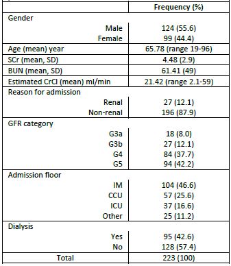 A total of 2138 patients with CKD were identified during the twelve-month study period. Based on the inclusion criteria, a total of 223 patients were considered for evaluation (10.4% of screened subjects). Those patients were prescribed 578 orders of our study medications. The clinical and demographic characteristics of all study patients (n=223) are summarized in Table 1. The study population consisted of 124 (55.6%) males and 99 (44.4%) females. The mean age was 65.78 years (range 19-96); the mean actual body weight was 76.3 kg; 27 (12.1%) were admitted for a renal reason. Most of the patients 104 (46.6%) were admitted to internal medicine (IM) floor; 84 (37.7%) and 94 (42.2%) patients were in G4 and G5 stages of CKD, respectively. Patients receiving hemodialysis were 95 (42.6%) of study group.