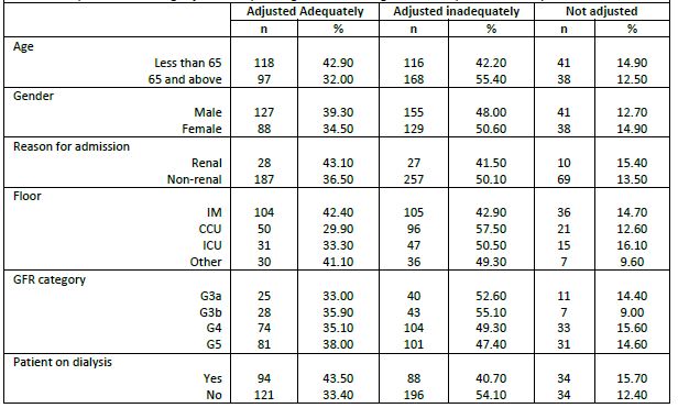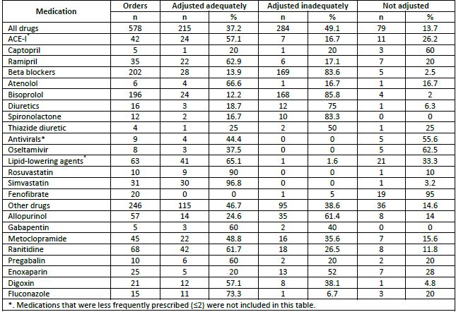Results: 2138 patients admitted in 2016 were screened. 223 adults receiving 578 drug orders that require adjustment were included. Among the 578 orders, 215 (37%) were adjusted adequately, 284 (49%) were adjusted inadequately, and 79 (14%) were not adjusted at all. Beta-blockers were the most inadequately dosed (83.6%) class of medication, whereas lipid-lowering agents had the highest percentage of adequate dosing (65.1%). As per patient, 84.3% of patients appeared to be receiving at least one inappropriate drug dose.