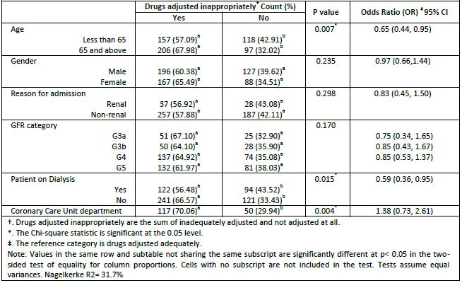 The results of a logistic regression, taking the inappropriate vs appropriate drugs doses adjustment as the dependent variable, showed that patients aged 65 years and above had more drugs adjusted inappropriately compared to those aged less than 65 years (OR=0.64). Patients admitted to the CCU floor (aOR=1.384) had more drugs adjusted inappropriately compared to those who did not enter the CCU floor, whereas patients who were not on dialysis had more inappropriate drug adjustment compared to those who were on dialysis (aOR=0.586) ( Table 4).
