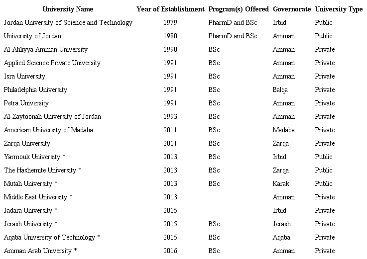 In Jordan, there are 18 pharmacy schools (5 public and 13 private). All pharmacy schools in Jordan offer a bachelor of pharmacy program, while two public schools offer a PharmD program ( Table 1). 12 The majority of students in these schools (77.6%) are enrolled in the bachelor of pharmacy program, and the remaining 22.4% are PharmD students. 12 The PharmD program in Jordan has additional therapeutic modules and hospital-based clinical rotations. The curriculums of these programs are routinely reviewed by the Higher Education Accreditation Commission (HEAC). However, the HEAC is not a pharmacy specific accreditation body; it is responsible for reviewing all programs offered by all higher education institutions in Jordan. The HEAC mandates all pharmacy curriculums to have at least 8 credit hours of pharmacotherapy courses with no recommendations to the specific contents for these courses. A previous study conducted in Jordan highlighted that current pharmacy graduates in Jordan lack basic competencies in pediatric pharmaceutical care. 13