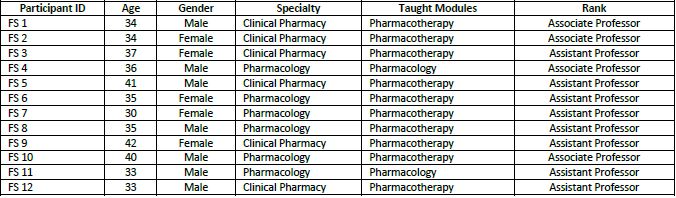 Qualitative one-on-one interview sessions were conducted. Purposive sampling was employed whereby websites of all pharmacy schools was searched for faculty involved in teaching patient-care related modules. In this study, we only included ten out of 18 pharmacy schools as the remaining eight schools started accepting students since 2013; therefore, they were excluded from the study as students in those schools were still in the first three years of their pharmacy programs and did not complete therapeutics or patient care courses. Identified faculty were contacted by phone or email and asked to take part in the study. Interviewees were informed that their responses would be anonymized and audio-recorded. To achieve maximum comfort, respondents were offered to do the interview in a place of their choice. Respondents were interviewed either in their work place, a public place of their choice, or over the phone. Written consent to record the interview was obtained and respondents were allowed to see the interview guide before the study begun.