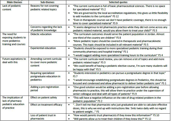 A sub-theme was the reasons for not covering pediatric related topics. Respondent thought that number of credit hours in both Pharmacy BSc and PharmD curricula adopted by their universities was overwhelming for students and it seemed impossible to add any further hours or courses to the program. Another reason reported by respondents was that the Pharmacy BSc and PharmD programs were general programs and if students were interested in any sub specialty this could be done on a postgraduate education or training basis. Some respondents thought that there were many subspecialties of pharmacy, not only pediatrics, and it is impossible to cover all those specialties in the undergraduate curricula while other respondents thought that pharmacy students should be taught and trained to deal with pediatrics, as more than one third of the population in Jordan are younger than 18 years of age. Those respondents said that medicine students get different training for the major specialties before graduation and the situation should be similar for pharmacy students.