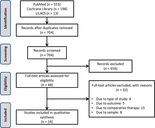 This systematic review identified 704 studies. After considering the strategy search and duplicity elimination, 656 studies were excluded by reading titles and abstracts ( Figure 1). No additional studies were identified by manual search. After a full assessment of 48 studies, 32 were excluded (justifications are given in Appendix B).