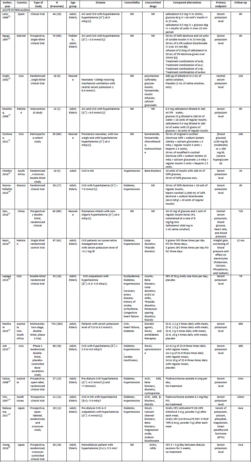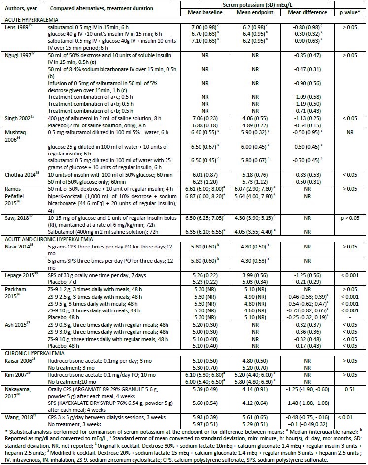Conclusions: Comparative cohort and case-control studies are need to evaluate the safety and effectiveness of new and traditional pharmacotherapies to support the development of guidelines about acute and chronic hyperkalemia, with high-quality evidence.