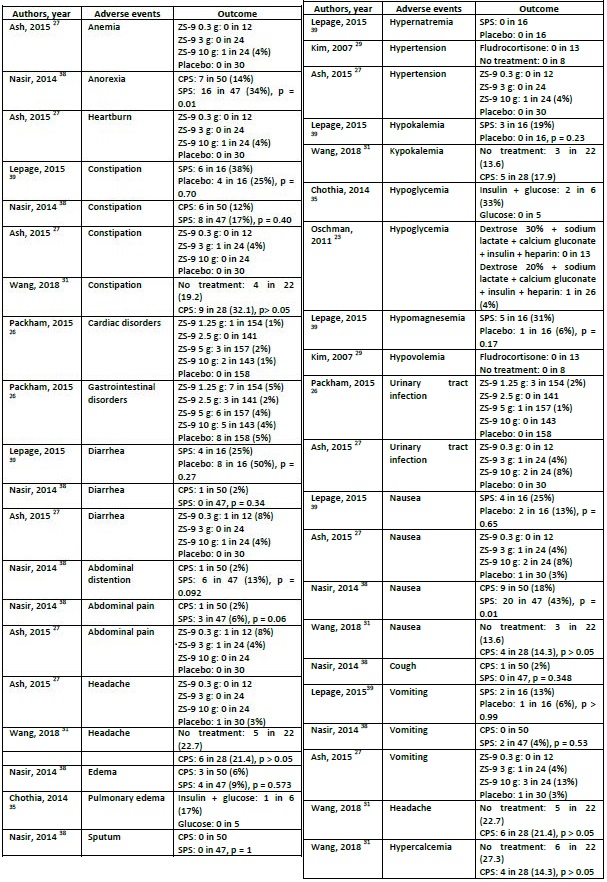 Our data show that when potassium binders (SPS, CPS and ZS-9) were compared with the effects of a placebo they significant decrease serum potassium levels. ZS-9 had a better safety profile. Recent publications suggest that both ZS-9 and patiromer are safer than SPS, however, they are not based on direct or indirect comparison methods. 11, 46