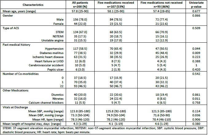 Descriptive statistics were used to describe patient demographics, the proportion and percentage of patients receiving secondary prevention medications, and target doses at discharge. Pearson’s chi-squared test, Fisher’s exact test (categorical variables) and the independent t-test (continuous variables) were used as appropriate, depending on the data, to test for associations between demographic characteristics and the use of medications at discharge. Based on the results of the above tests, variables with statistical significance associated with receiving all five medications at discharge were also subjected to binary logistic regression in order to determine independent predictors associated with receiving all five medications at discharge. Data were analysed using SPSS version 26.0 (INM Corp, Chicago, IL) and two-tailed p- values less than 0.05 were used to indicate statistical significance.