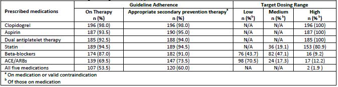 Regarding optimal dosing, all patients prescribed antiplatelets received optimal doses: aspirin 100 mg and/or clopidogrel 75 mg daily. Of the 94.5% of patients (n=189) who received a statin, 80.9% (n=153) were prescribed a high-intensity statin. Of the 69.5% of patients (n=139) that received ACEI/ARBs, 12.2% (n=17) were prescribed a dose in the high target range. Of the 87.0% of patients (n=174) that received a beta-blocker, 9.2% (n=16) were prescribed a dose in the high target range. ( Table 2). Of the 53.5% of patients (n=107) prescribed all five medication classes, only 1.9% patients (n=2) were prescribed all five medication classes within the high target dose range.