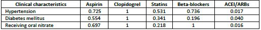 Binary logistic regression indicated that comorbidities such as hypertension (odd ratio=2.05, 95%CI 1.11 to 3.79; p=0.022) and diabetes mellitus (odd ratio=0.42, 95%CI 0.23 to 0.78; p=0.006) as well as oral nitrate prescription (odd ratio=2.95 95%CI 1.22 to 7.12; p=0.016) were associated with receiving all five medications at discharge.