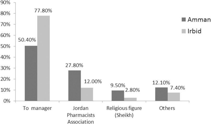 In addition, majority of participants (Amman= 87.9%, Irbid= 99.6%) agreed/strongly agreed to help their patients after their official working shifts, and majority (Amman= 83.9%, Irbid= 84.9%) were interested/ highly interested in calling the patient’s doctor if they noticed that there was something wrong with the prescription. In Irbid, majority of pharmacists (61.8%) disagreed/strongly disagreed with the statement about proposing brands instead of generic drugs, in contrary to only 20.4% of pharmacists from Amman (p=0.714). In Irbid, about 77.8% of pharmacists were not interested in talking about the lethal dose of certain drugs if they suspected abuse by the patients versus only 39.6% in Amman (p< 0.05; Table 2). Pharmacists from both cities stated that they would refer their ethical dilemmas once identified, mostly to their managers, followed by Jordanian Pharmacists Association ( Figure 1).