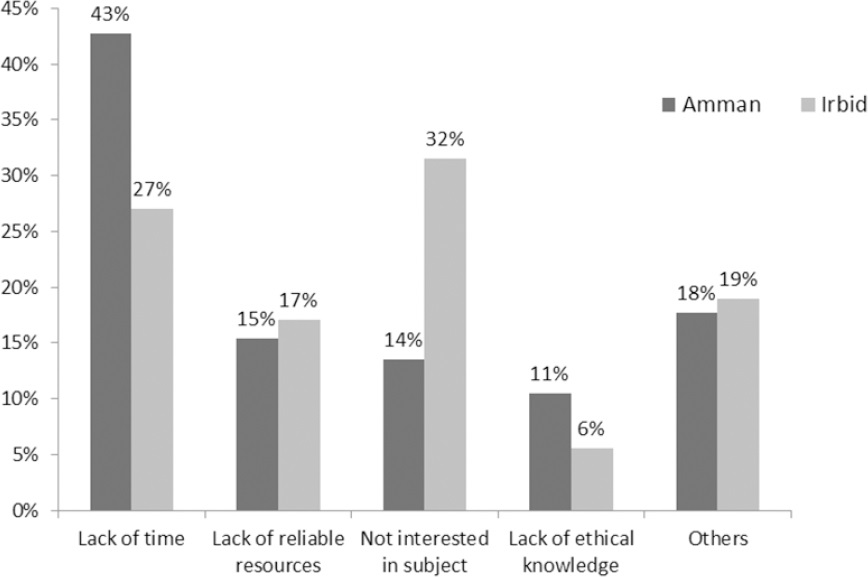Barriers that limited pharmacists from discussing ethical issues with their patients included: lack of time (Amman 43.0%, Irbid 27.0%) and lack of reliable resources (Amman 15.0, Irbid 17.0%). Lack of ethical knowledge (such as lack of knowledge of basic Jordanian ethical standards), lack of skills in making ethical decisions (including the ability to identify the ethical problem), inability to identify the values or legal constraints involved in each scenario and inability to develop options for action were reported as other barriers by the participants preventing them from performing their role in this area ( Figure 2).