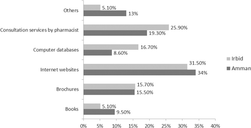 Pharmacists reported that they mostly use the Internet as a resource to help them in resolving ethical issues concerning their patients (Amman 43.0% vs. Irbid 31.5%). This was followed by discussions with their peers and other health care professionals about the ethical issue (Amman 19.3% vs. Irbid 25.9%). Brochures designed by the Jordanian Pharmacists Association discussing ethical principles were also mentioned (Amman 15.5%, Irbid 15.7%). Few pharmacists referred back to written materials and books (Amman 9.5%, Irbid 5.1%; Figure 3).