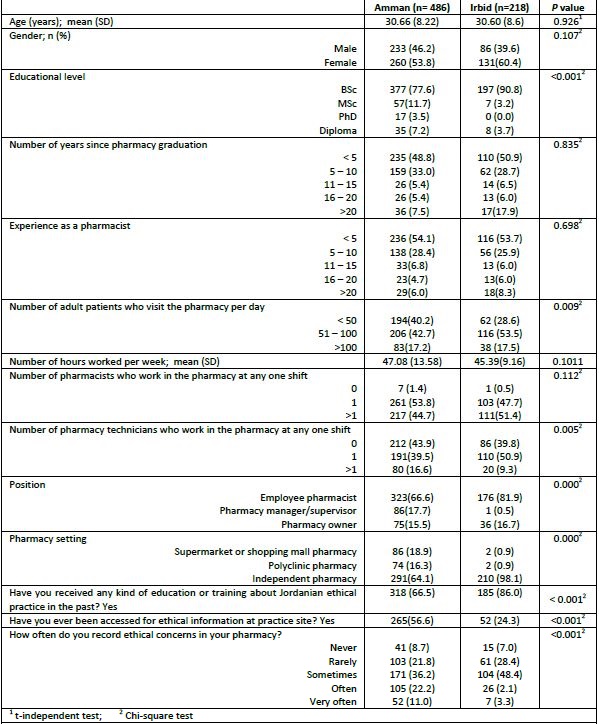 The majority of respondents from Amman (66.5%) and Irbid (86.0%) reported receiving previous education on ethics concerning pharmacy practice services in Jordan (p<0.001). In Amman, more than half (56.6%) of the pharmacists reported that they had access to ethical information resources at their practice site versus 24.3% from Irbid (p<0.001). There was a significant difference (p<0.001) between both cities with regards to pharmacists receiving previous education or training on the Jordanian Code of Ethics, and the frequency of their documentation of ethical concerns ( Table 1).