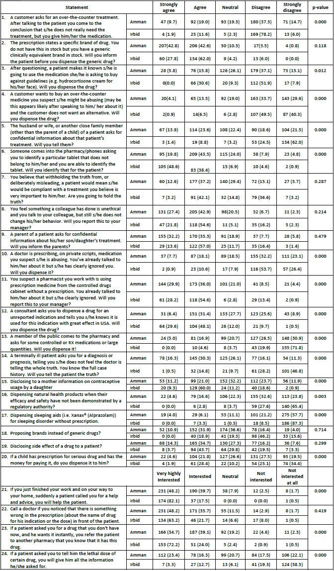 Most respondents reported that they would not (disagree /strongly disagree) dispense a controlled drug without a legal prescription, as it is illegal to dispense such drug class without prescription, (Amman=57.4% versus Irbid=91.7%, p<0.001). More pharmacists from Irbid (75.0%, p<0.001) versus Amman (27.4%) would not (disagree /strongly disagree) inform a terminally ill patient if they asked for a diagnosis in case their doctor decided to hide such information. Also, about half (agree /strongly agree) of pharmacists (from both cities) said that they would withhold the truth about medication side effects if that would make the patient more compliant with their medication. As for generic drugs, the majority (agree /strongly agree) from both cities (Amman 85.4% versus Irbid 89.8%) would inform the patient before they dispense a generic drug if the prescription stated a specific brand of medication and it was not found in stock. Most respondents said they would report (agree /strongly agree) to their manager if they perceived their colleague was doing something unethical, after talking to the colleague in question first. (Amman= 70.3%, Irbid= 76.4%).