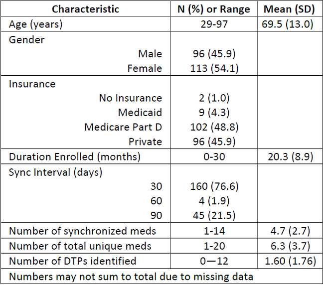 Results: The study involved 209 subjects, 54% women, with a mean age of 69.5 years and. The average number of medications synchronized was 4.7, the mean total number of medications was 6.3, and mean length of time in the program was 20 months. The DTPs (n=334) identified included needs additional drug therapy (43.1%), inappropriate adherence (31.4%), unnecessary drug therapy (15.0%), and adverse drug reaction (9.6%). The regression showed age and number of medications was positively associated with number of DTPs identified, but months enrolled was not.