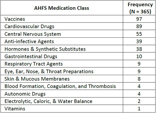 This was a cross sectional analysis of systematic random sample of patients in the ABM program. Patients were not included in the analysis if they did not have an entry for their synchronization. There were many DTPs associated with the need for vaccination given that influenza season was approaching. It is possible that this is a seasonal effect and a different cross-section during a different time of year would yield different results. More work is needed to test such a seasonal difference. The authors made their best effort to categorize the medications for their most common use, but this was not validated for each patient. It also was beyond the scope of this project to analyze the acceptance rate of interventions by the patient and, or the prescriber. The cross-sectional nature of the analysis also did not allow assessing if DTPs were carried forward.