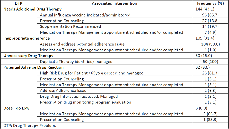 The objectives of the study were: To describe the drug therapy problems (DTPs) identified for patients enrolled in an Appointment Based Model (ABM) for medication synchronization and described the pharmacist-delivered clinical interventions. Also, to test if the duration of patient enrollment in a medication synchronization program impacts the number of DTPs identified.