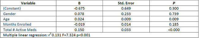 Nine patients were excluded from the regression due to missing date of enrollment. The regression ( Table 4) explained 10.2% of the variation in the number of DTPs identified. Age and the total number of medications synchronized had significant positive associations with DTPs identified. The regression was also run for total medications rather than synchronized medications and yielded similar results.