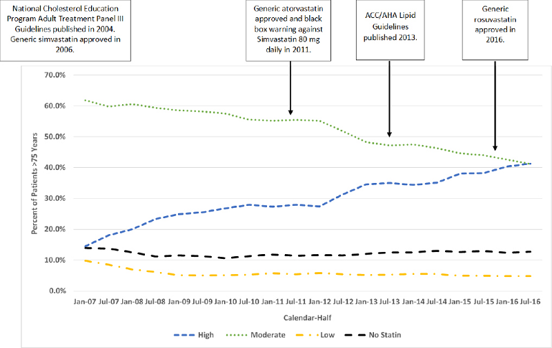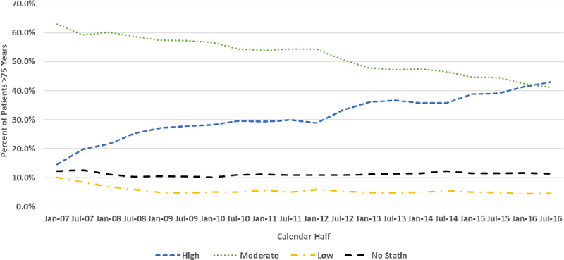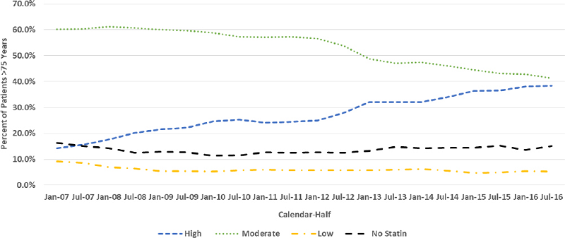 Methods: The study was conducted in an integrated healthcare delivery system. Patients were 76 years or older with validated coronary ASCVD. Data were collected from administrative databases. Statin intensity level was assessed in eligible patients on January 1st and July 1st from January 1, 2007 to December 31, 2016.