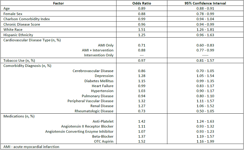 In multivariable analysis, factors independently associated with having received HIST include white race (adjusted odds ratio (aOR)=1.51), depression (aOR=1.28), PVD (aOR=1.32), and renal disease (aOR=1.27) comorbidities, anti-platelet (aOR=1.42) and beta-blocker (aOR=1.37) dispensings, and OTC aspirin use (aOR=1.52) ( Table 2). Factors associated with being less likely to having received HIST include age (aOR=0.89), female sex (aOR=0.88), CDS (aOR=0.96), and AMI only (aOR=0.71) and AMI + intervention (aOR=0.88) compared to intervention only.