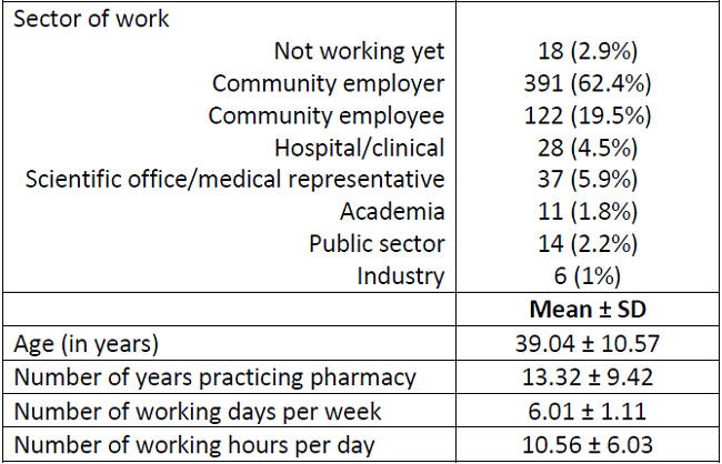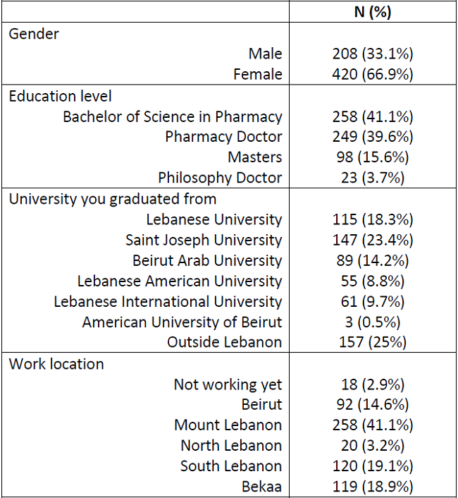 The sociodemographic characteristics of the participants are summarized in Table 1. The mean age of the participants was 39.04 (SD 10.57) years, 66.9% of them were females, and 41.1% of them had a bachelor degree in pharmacy and worked in Mount Lebanon. In addition, the highest percentage of interviewed pharmacists (62.4%) were community pharmacy employers, with a mean years of practicing pharmacy for the whole sample of 13.32 years, a mean of 6.01 working days per week and a mean of 10.56 working hours per day. The results also showed that 373 (59.4%) owned a computer, 355 (56.5%) owned a smart phone. The description of other characteristics of participants can be found in Table 2.