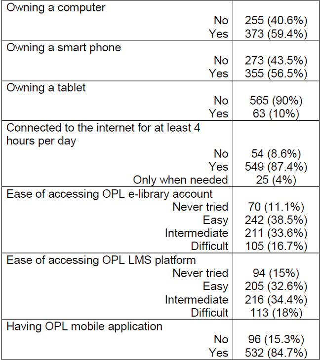 Moreover, a significantly higher percentage of pharmacists who found the access to OPL e-library (40.2%) and OPL LMS platform (34.9%) easy, enrolled in the CE program compared with those who did not. In parallel, the bivariate analysis showed that a significantly higher mean of computer literacy (38.38 vs. 34.86) was found among pharmacists doing online CE credits; this result was confirmed in multivariable analysis for all types of CE, where a higher general confidence with computer use (aOR=1.058) was significantly associated with higher odds of doing both types of CEs. This finding is expected, given that using the OPL e-library requires some basic computer skills, and people with very low computer literacy would not undergo such endeavor. Furthermore, people in remote areas have difficulties to connect to the Internet since they have access only to low-speed Internet when available. Our results are similar to those of Chiu et al. in a study conducted in Taiwan in 2016 showing that internet self-efficacy was essential to in increasing self-regulated learning in online continuing education, especially among older pharmacists. 24