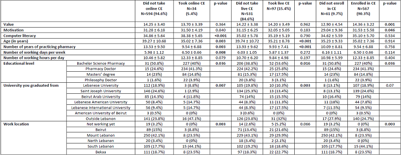 Results: Out of the 750 questionnaires distributed, 628 (83.73%) were filled out and returned to be analyzed. The mean age of the participants was 39.04 (SD 10.57) years, 66.9% of them were females, and 41.1% of them had a bachelor degree in pharmacy and worked in Mount Lebanon. Among the 628 respondents, 567 (90.3%) have earned at least one CE credit. Of those, 5.4% took mainly online courses, 15.4% took mainly live courses and the remaining took both types of CE. Higher motivation (aOR=1.05; CI 0.994-1.109) and higher value (aOR=1.076; CI 0.968-1.197) were associated with higher odds of taking live CE courses. Higher motivation (aOR=1.07; 95%CI 0.994-1.152) was associated with higher odds of taking online CE courses. Higher motivation (aOR=1.059; 95%CI 1.006-1.114) and higher general confidence with computer use (aOR=1.058; 95%CI 1.012-1.106) were significantly associated with higher odds of taking both types of CE courses.