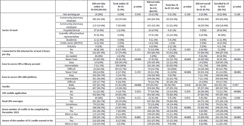 Conclusions: A high percentage of Lebanese pharmacists enrolled in the CE system, mainly driven by motivation and value of CE, in addition to a higher general confidence in computer use. Further efforts should be exerted by the Lebanese Order of Pharmacists to motivate pharmacists and help them improve their computer literacy, which is expected to improve not only enrollment in CE activities, but also the completion of their CE requirements.