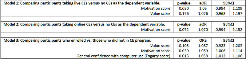 The results of the multinomial logistic regression analyses are shown in Table 4. A first logistic regression, comparing participants taking live CEs only versus no CEs as the dependent variable, showed that higher motivation to CE (aOR=1.05) and higher value of CE (aOR=1.076) were associated with higher odds of doing live CEs ( Table 4, Model 1). When comparing participants doing online CEs only to those who did not do any CEs, the results showed that higher motivation to CE (ORa=1.07) was associated with higher odds of doing online CEs ( Table 4, Model 2). When comparing participants who do both live and online CEs versus those not doing any CEs, the results showed that higher motivation to CE (ORa=1.059) and higher general confidence with computer use (computer literacy) (ORa=1.058) were significantly associated with higher odds of doing both types of CEs ( Table 4, Model 3).