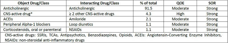 Only (1.6%) of total prescribed PIMs were due to drug-drug interactions (the 1 st newly added component by the 2015 AGS Beers Criteria). Almost (91.5%) of detected interactions resulted from the simultaneous prescribing of at least two different medications with anticholinergic properties including first generation antihistamines (chorpheniramine and triprolidine), antimuscarinic (oxybutynin), antispasmodics (clidinium-chlordiazepoxide and hyoscyamine), Table 4.