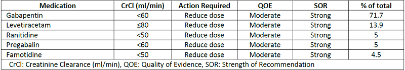 5) Medications to avoid or their dosage should be adjusted based on patient kidney function (Class V). Using at least one of the listed medications along with patient creatinine clearance below indicated thresholds was considered as a PIM (e.g. patient with creatinine clearance <30ml/min and was concurrently prescribed enoxaparin was considered to have a PIM).