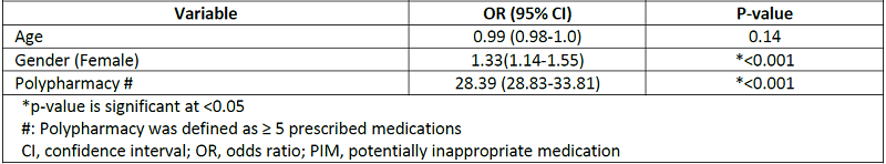 Having at least one identified PIM was significantly associated with female gender (adjusted OR: 1.33, 95% CI: 1.14-1.55) and polypharmacy (adjusted OR: 28.39, 95%CI: 23.83-33.81), Table 6.