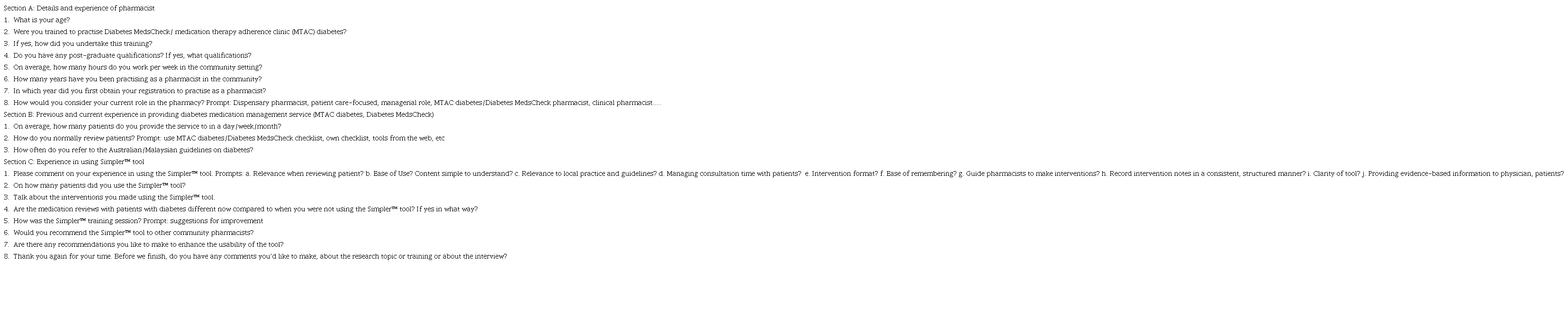 Semi-structured interviews were conducted by SA (July to August 2015). Face-to-face interviews were conducted with two pharmacists at their workplaces and two at a university. Telephone interviews were conducted with the remaining eight pharmacists. The interview process followed Kvale’s seven stages for conducting interviews and the requirements of consolidated criteria for reporting qualitative research guidelines (COREQ). 21, 22 The interview guide consisted of three sections, sections A, B and C, presented in Table 2. The interviewer followed the interview guide while allowing opportunity for probing questions and clarifications. The interview guide was pilot tested with two independent pharmacists.