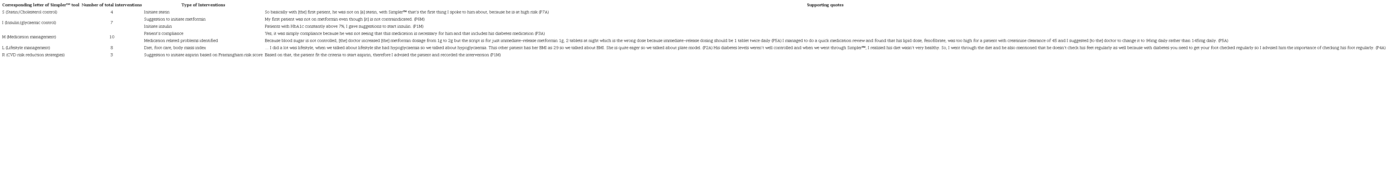 All 12 pharmacists participated in the semi-structured interviews. The average duration of the interviews was 32 minutes with the face-to-face interviews ranging between 19 to 32 minutes (mean 26 minutes) and the telephone interviews between 16 to 54 minutes (mean 36 minutes). Most participants (91.7%; 11/12) used the Simpler™ tool to facilitate their intervention process. Those included: to add a statin to achieve cholesterol targets; initiate metformin in patients with uncontrolled diabetes; dose adjustments and improving medication adherence. One participant did not use the tool as this participant only focused on lifestyle factors during patient consultations. The participant therefore expected more detailed counselling points on lifestyle management. Participants reported making interventions using one or more tool indicators. The types and number of interventions made are provided in Table 4 with supporting quotations.