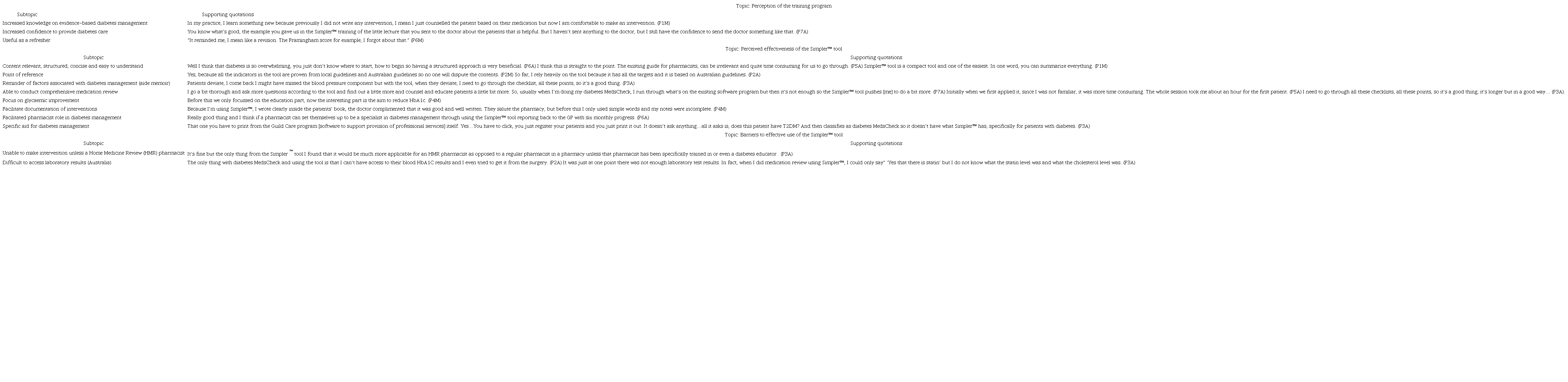 All 12 participants found the Simpler™ tool to be beneficial when conducting medication reviews with patients. Participants used words such as ‘organised’, ‘sequential’, ‘straight to the point’, ‘my accounting made relevant’, ‘compact’, ‘complete’ and ‘easiest tool’ to describe the benefits. Participants from both Malaysia and Australia expressed their reliance on the Simpler™ tool when conducting MMS as they considered it to be a point of reference. All participants expressed the tool as an ‘aide memoir’ in recollection of the factors associated with diabetes management.