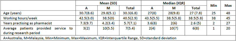 Of the 13 pharmacists approached, 12 consented to undertake the study. There was equal representation of participants from Malaysia (n=6) and Australia (n=6). Most participants (75%, 9/12) had less than three years’ experience of conducting diabetes management. Table 3 presents participants’ demographic data and practice experiences.