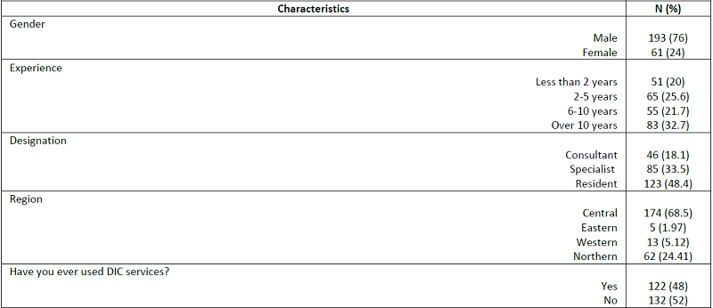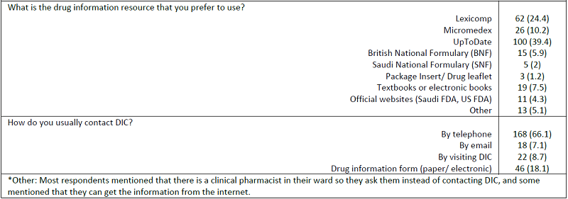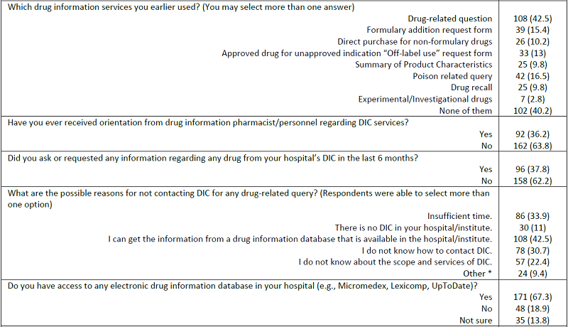 A total of 500 electronic questionnaires were distributed during the study period, and only 254 physicians completed the survey, i.e., 50.8% response rate. Majority of the respondents (n=193, 76%) were male, whereas one-third of the physicians (n=83; 32.7%) had over ten years of clinical experience. Nearly half of the respondents (n=131) were residents. Of these respondents, 85 (33.5%) and 46 (18.1%) were specialists and consultants, respectively. Regarding the use of DIC services, 48% of the respondents mentioned that they had used DIC services, and more than half of the physicians never contacted the DIC for drug-related queries during their professional practice. When asked about getting orientation from DIC personnel regarding DIC services, merely 36.2% of physicians responded positively. Moreover, 96 respondents (37.8%) had contacted DIC six months before the initiation of this study. Forty-two percent of the respondents indicated that they can get the required information from drug information databases available at their institution; this was the most common reason for not contacting the DIC. Other reasons were insufficient time (86, 33.9%) and lack of knowledge regarding DIC (78, 30.7%). The majority (66.1%) of the physicians contacted DIC by telephone, followed by the submission of papers or electronic forms (18.1%). The summary of these results is listed in Table 1.