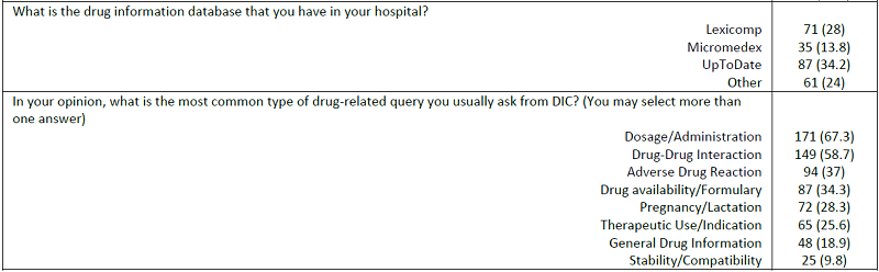 Conclusions: Only 10% of the respondents were not aware of the presence of DIC at their institution. The UpToDate online drug information database was the most frequently used database by the physicians. Our findings showed that there is a need for conducting educational programs for physicians regarding DIC services. Such an attempt can increase the frequency of drug-related queries and promote patient safety.