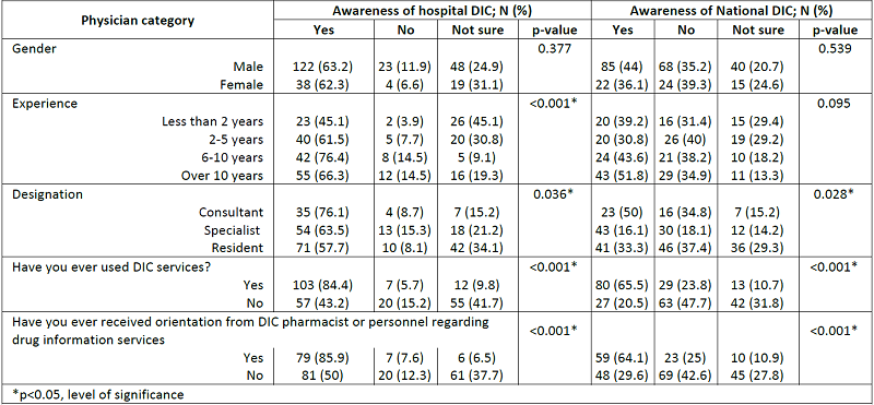 The most frequently utilized DIC service by physicians was related to drugs ( Table 1). Two-thirds of the queries asked by the physicians were related to the dosage and administration of drugs, followed by drug-drug interaction (58.7%) and adverse drug reaction (37%). Table 1 also shows that UpToDate was the most preferred drug information database among physicians, followed by Lexicomp and Micromedex. Majority of the respondents were aware of the existence of DIC at the institutional and national levels. Table 2 shows that there is a statistically significant difference between the designations of the respondents, earlier use of DIC services, received an orientation from the DIC pharmacist, and awareness of both institutional and national DIC.