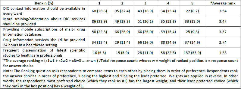 The respondents ranked five opinions for the improvement of DIC services. Sixty physicians (23.6%) considered the availability of the DIC contact details in all clinical wards as the most important area of improvement. Eighty-six physicians (33.9%) considered training and orientation about DIC services as the most important area of improvement. More than half of the physicians (n=137) identified the frequent dissemination of recently published scientific studies to the healthcare professionals as the least important of the suggestions ( Table 3).