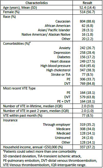 A total of 4,092 patients had access to the online survey. The data set included 971 who completed the survey and 64 patients were removed from the data set for reasons that included no VTE within past two years, choosing none of the medication options during most recent VTE treatment, and completing the survey in an unrealistically short amount of time (less than 6 minutes). A total of 907 patients were included in the final analysis ( Table 1). The mean (SD) age of patients was 52.4 (14.4) years and 56.7 percent were women. In the overall population, the most common comorbidities were hypertension (45.6%), hyperlipidemia (38.3%), depression (28.4%), heart disease (27.5%), anxiety (26.7%), and diabetes (17.2%). The most recent VTE episode was deep vein thrombosis (DVT) in 63.8 percent, pulmonary embolism (PE) in 18.1 percent, or both DVT and PE in 18.1 percent of patients.