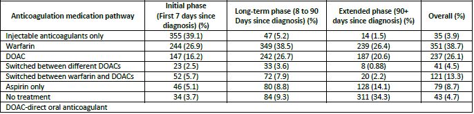 The proportions of patients corresponding to the various treatment pathways in each treatment phase were calculated by dividing the number of patients in each pathway by the total number of patients. Overall anticoagulant pathways were also assigned to each patient considering only anticoagulants used during days 8 to 90+. The proportions of patients who used injectable anticoagulants and/or aspirin in addition to other anticoagulants in each treatment phase were also calculated. Data was summarized using basic descriptive statistics, for example proportions for categorical variables and means and standard deviation (SD) or median and interquartile range (IQR) for continuous variables.