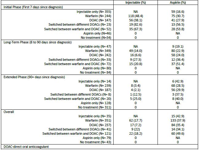 We identified the following antithrombotic usage patterns: injectable anticoagulants only, aspirin therapy only, warfarin, DOACs, patients who switched between warfarin and DOACs, patients who switched between different DOACs, and no treatment ( Table 2). Overall, 38.7% of patients received warfarin-based treatment, 26.1% DOACs, 8.7% aspirin monotherapy and 3.9% injectable therapy only. 13.3% of patients switched between warfarin and DOACs, 4.5% switched between different types of DOACs, and 4.7% reported not receiving any of these treatments.
