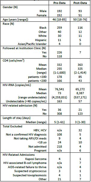 During the 6 month enrollment, 203 patient alerts were sent to the investigators through the EMR system, of which 144 patients were included in the study. Most of the excluded patients were either co-infected with HBV or HCV (N=32), were <18 years old (N=10), or pregnant (N=6). Baseline characteristics ( Table 1) included a mean age of 50.6 years, 65% male, and 80.6% African-American. A CD4 count was documented for 128 patients, with a mean of 363 cells/mm 3 (range 1-1,414 cells/mm 3). Approximately 65% of these patients had a CD4 count >200 cells/mm 3. A viral load was documented for 81.3% of patients (N=117), and was detectable (>20 copies/mL) in 51.3% of those patients (N=60). The average daily pill burden was 3.7 tablets (range 1-9). Other baseline information included 53.5% (N=77) of patients following at one of our institution’s outpatient HIV clinics. Infectious disease was on consult for 43.1% (N=62) of patients, and a PharmD was on service for 69.4% (N=100) of patients. Compared to the historical data, there were little differences found between pre- and post-data, with the exception of mean CD4 332 cells/mm 3 in pre and 363 cells/mm 3 in post (p = 0.004).