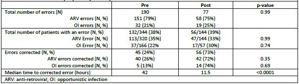 We found no stastically significant difference between the pre- and post- medication error rates of either ARV (p=0.99) or OI prophylaxis medications (p=0.74). Likewise, we found no statistically significant difference in the rates of corrected ARV (p=0.35) or OI prophylaxis medication (p=0.69) errors.