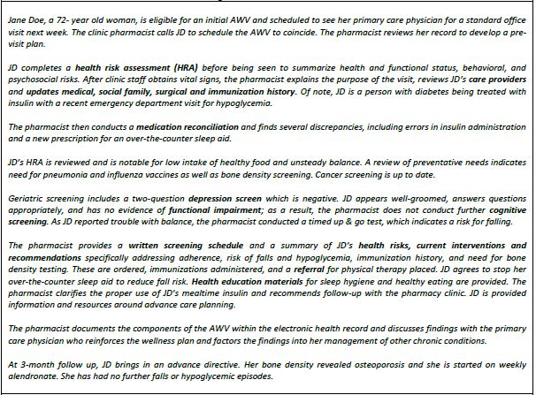 Smith MR. FAQ: Medicare Annual Wellness Visits. American Society of Health Systems Pharmacists. Available at: https://www.ashp.org/-/media/assets/pharmacy-practice/resource-centers/ambulatory-care/medicare-annual-wellness-visits.ashx (accessed Aug 1, 2019).